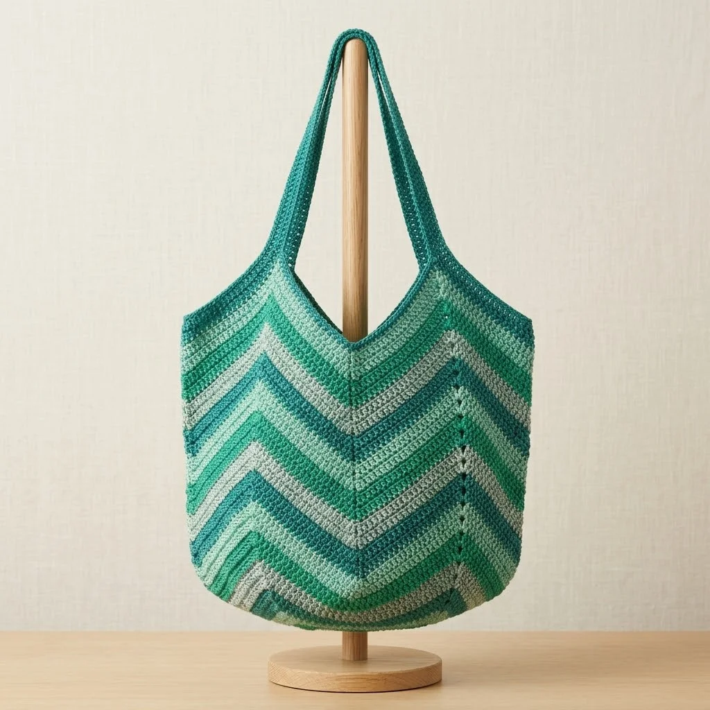 ფერების გამა: ჩანთაში ჰარმონიულად მონაცვლეობს ზურმუხტისფერი (Emerald), ზღვის ტალღისფერი (Teal), პიტნისფერი (Mint) და ნაცრისფერი ტონები. ფერების ეს "Chevron" (ზიგზაგისებური) გარდამავალი ეფექტი ჩანთას მოცულობასა და სიღრმეს მატებს.