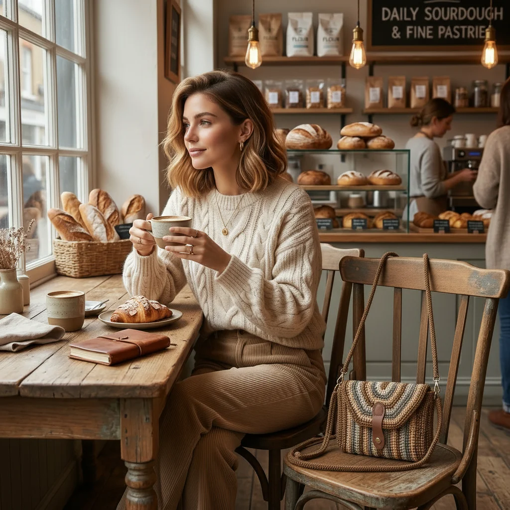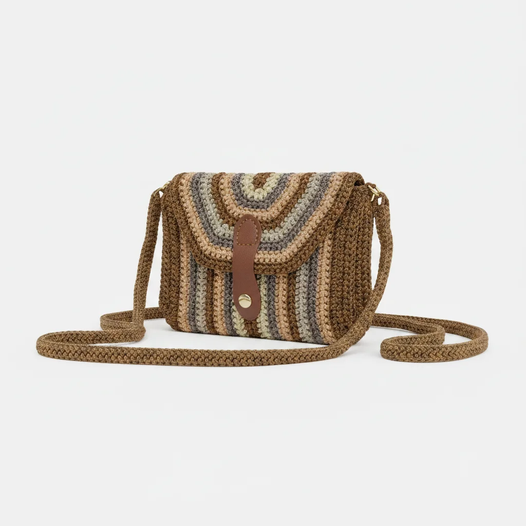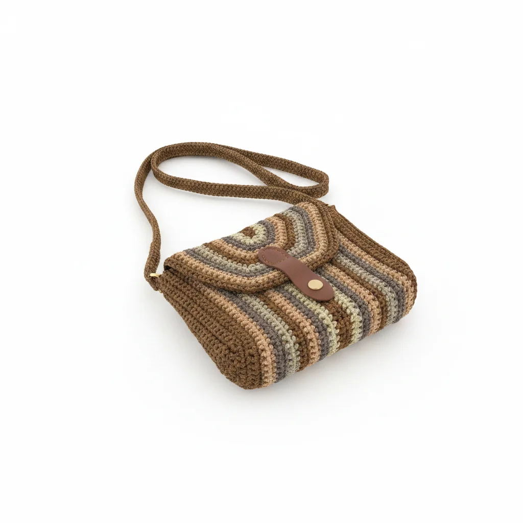 ფერების პალიტრა: ჩანთის მთავარი ხიბლი მისი ჰორიზონტალური, ტექსტურირებული ზოლებია. მასში ჰარმონიულად ერწყმის შოკოლადისფერი (Chocolate Brown), თბილი კაპუჩინოსფერი (Cappuccino Beige), კრემისფერი (Cream) და ღრმა, მომწვანო-ნაცრისფერი (Olive Grey) ტონები. ეს კომბინაცია ჩანთას ვინტაჟურ და მყუდრო იერს სძენს.