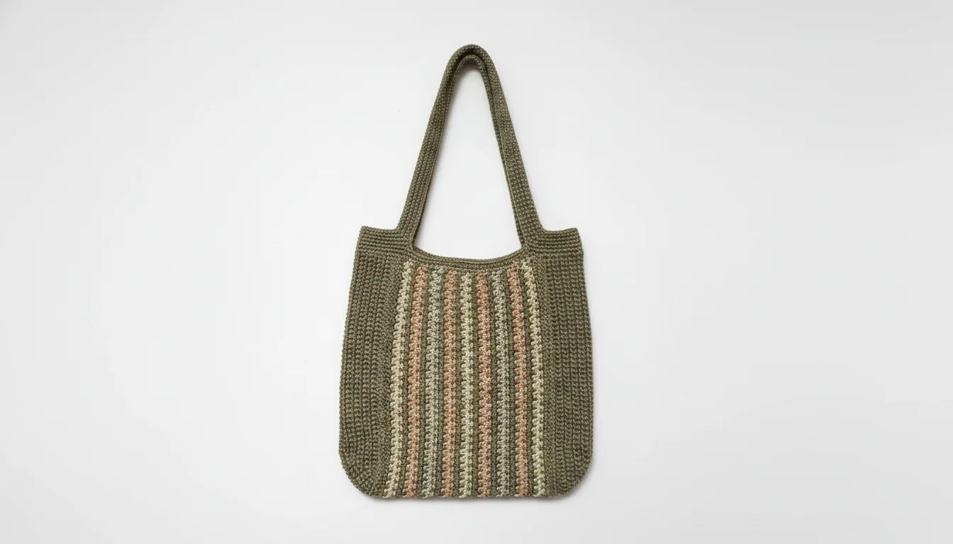 ფერების გამა: ჩანთის ძირითადი ფერია მშვიდი, ხაკისფერი (Olive/Khaki Green). ცენტრალური ნაწილი გაფორმებულია ვერტიკალური ზოლებით, სადაც ჰარმონიულად ერწყმის კრემისფერი, ნაზი ვარდისფერი და მუქი მწვანე ტონები.