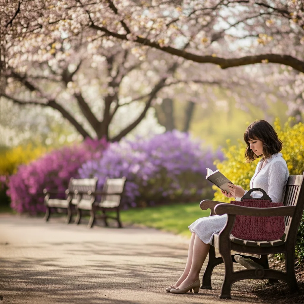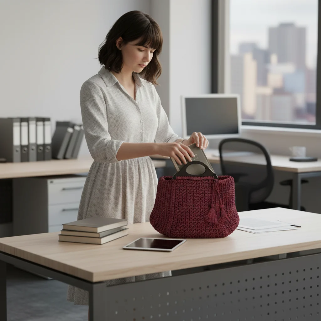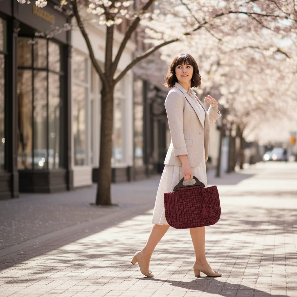 მუქი, თითქმის შავი ხის (ან ხის ეფექტის) გეომეტრიული სახელური ჩანთას სიმყარესა და ხასიათს მატებს. კონტრასტი სახელურსა და ნაქსოვს შორის ხაზს უსვამს დიზაინის ორიგინალურობას.
