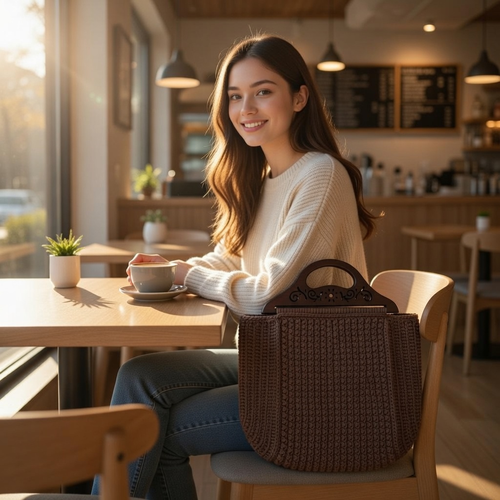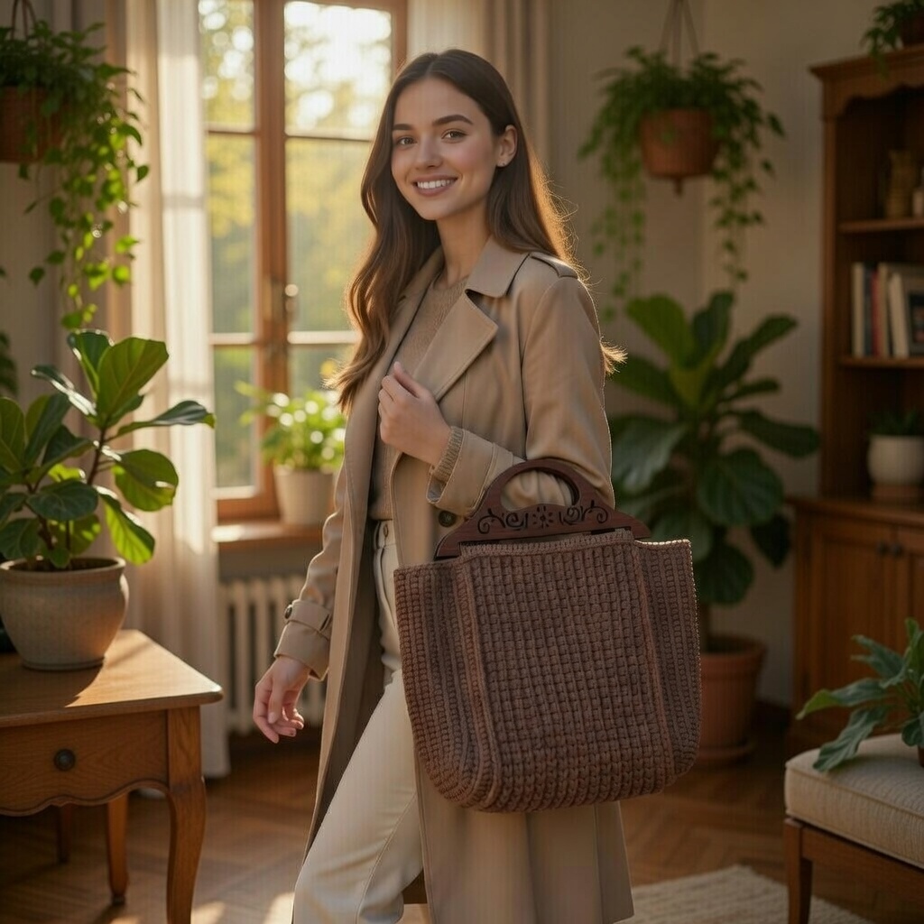ელეგანტური ნაქსოვი ჩანთა მუქი ყავისფერი ტონით და დეკორატიული ხის სახელურით. ხელნაკეთი მაღალი ხარისხის ძაფით.