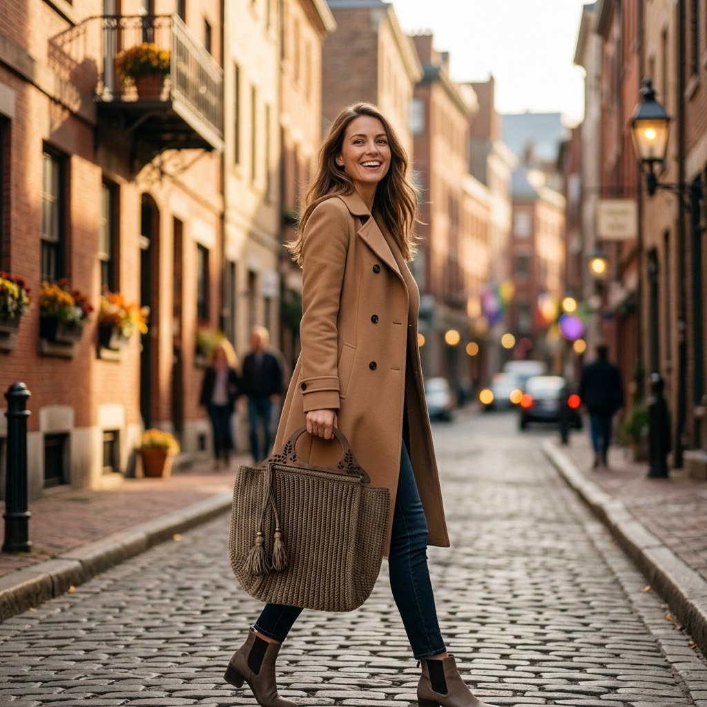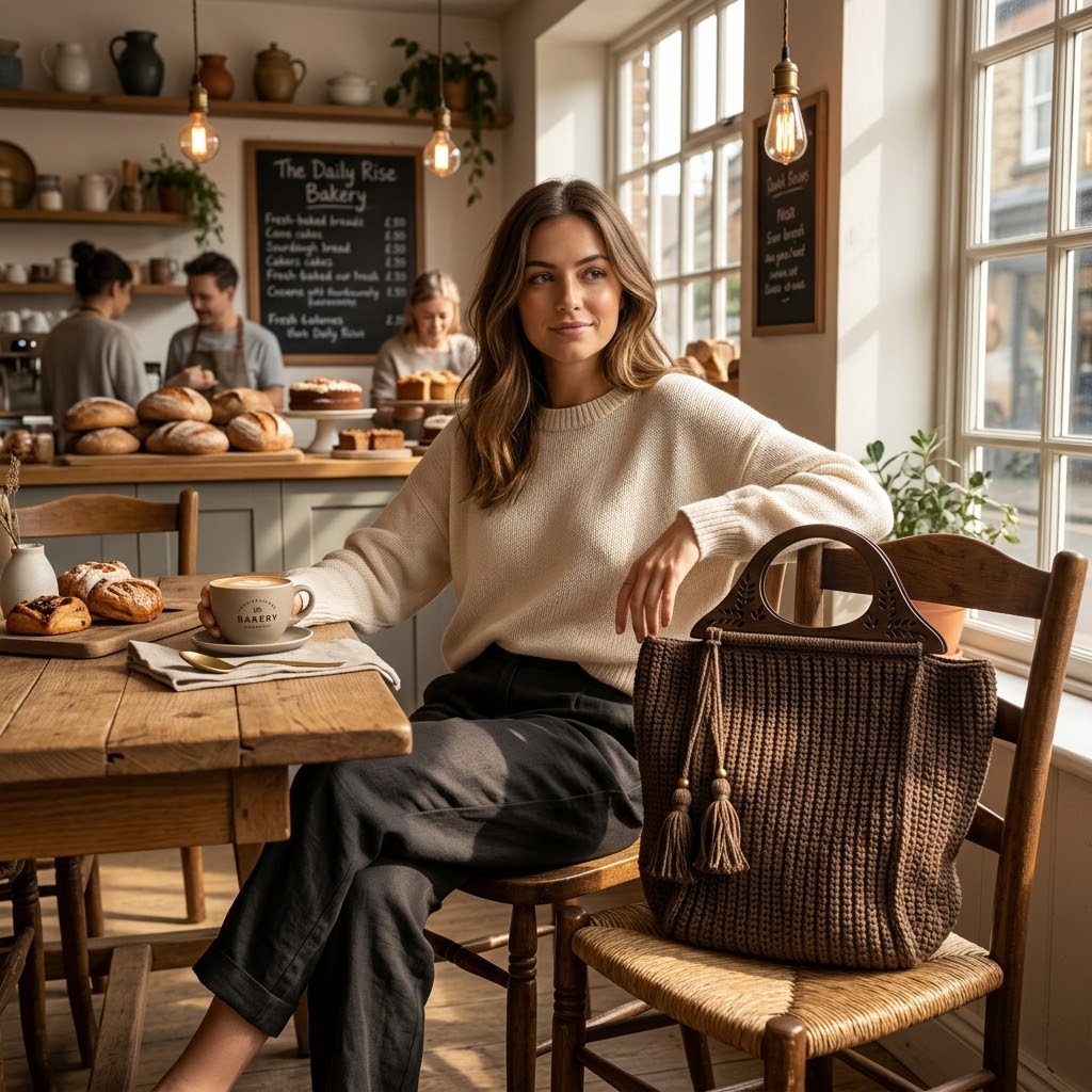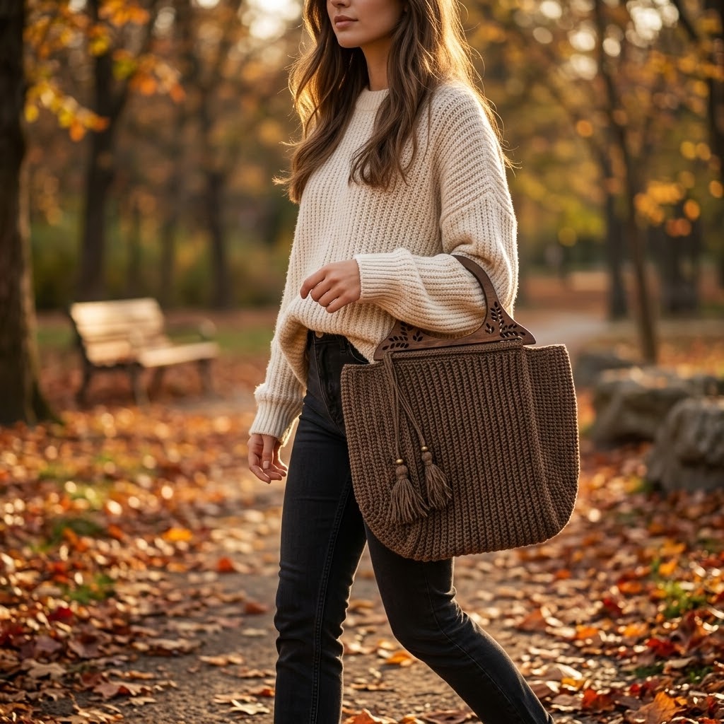 ყავისფერი ჩანთა ხის დეკორატიული სახელურით.
