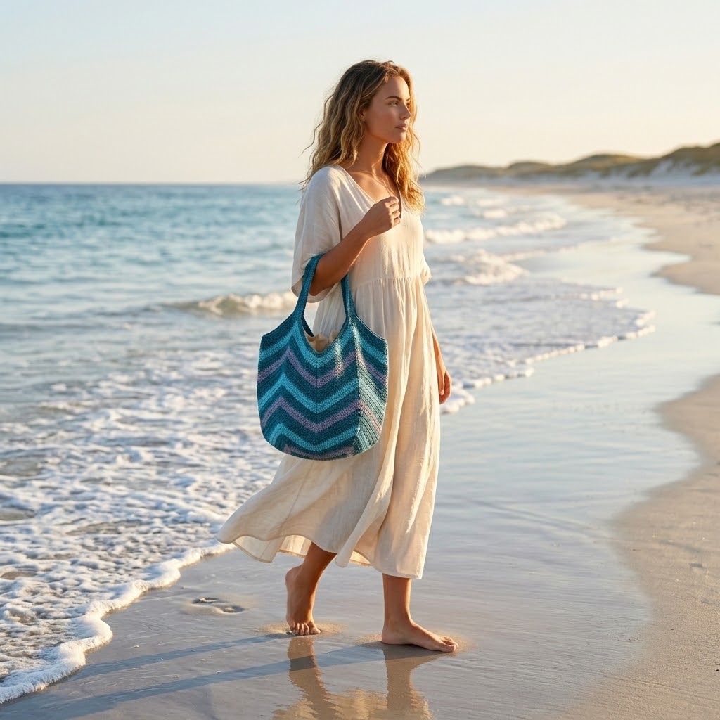 ლამაზი ნაქსოვი ჩანთა ლურჯ ტონებში. იდეალურია ყოველდღიური გამოყენებისთვის.