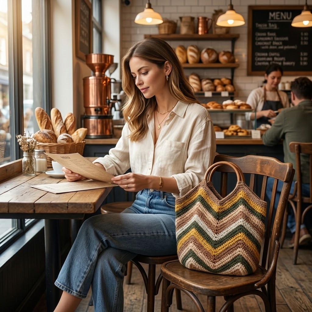 თბილი შემოდგომის ფერების ნაქსოვი ჩანთა, ყავისფერ და ოქროსფერ ტონებში.