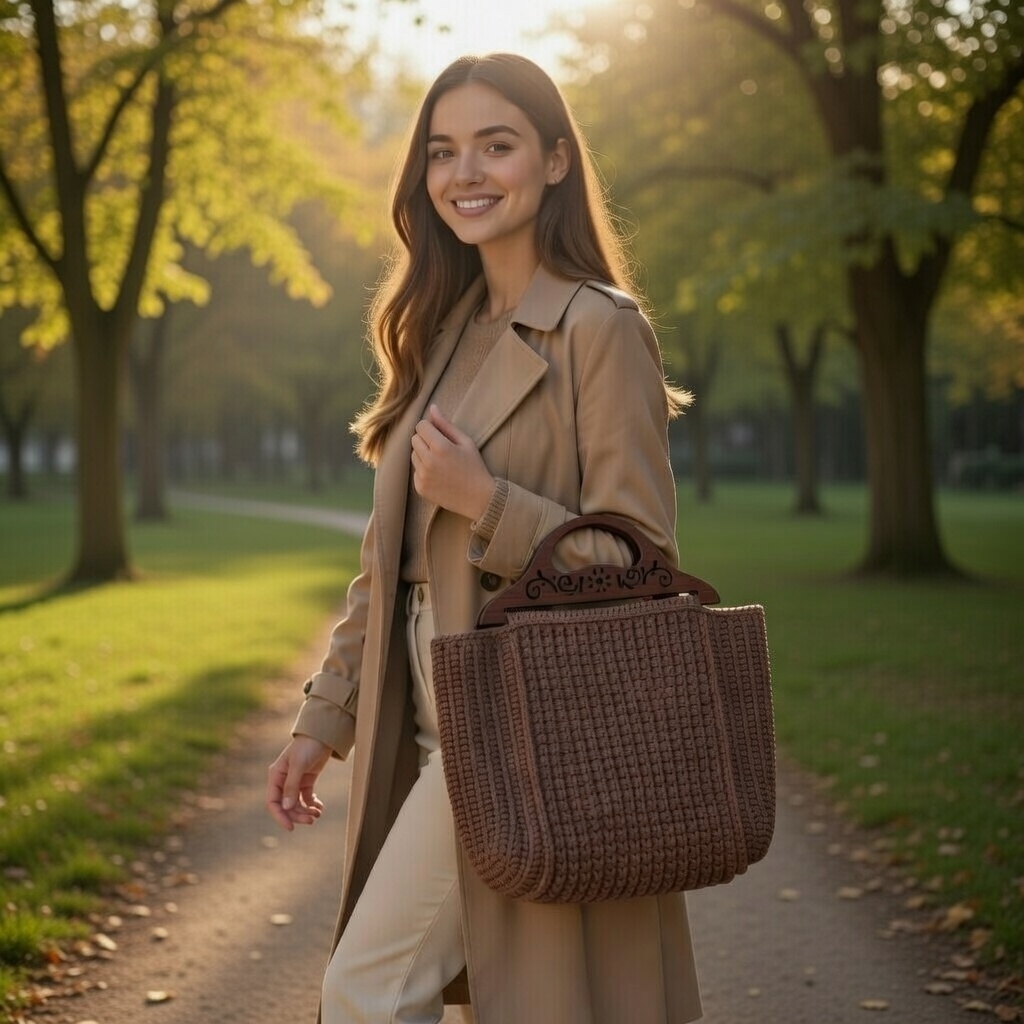 ელეგანტური ნაქსოვი ჩანთა მუქი ყავისფერი ტონით და დეკორატიული ხის სახელურით. ხელნაკეთი მაღალი ხარისხის ძაფით.