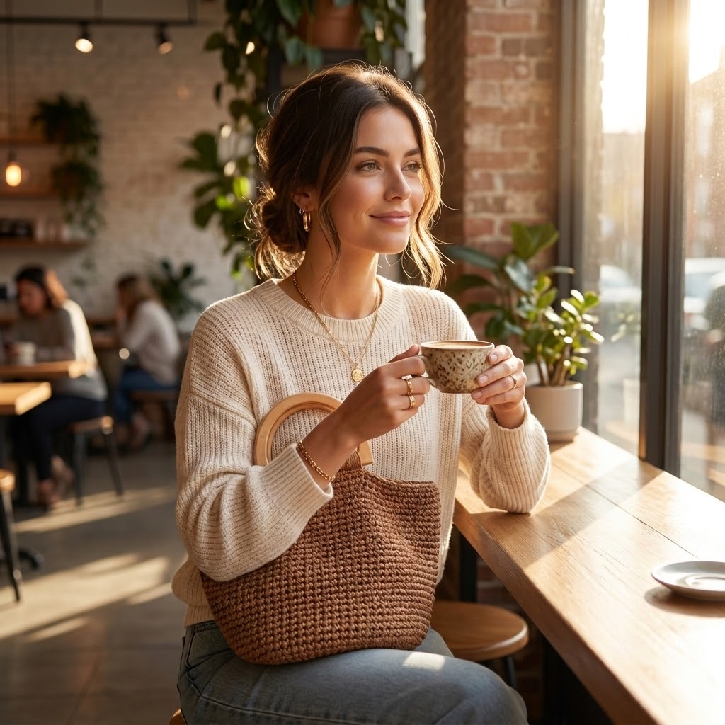 კარამელის ფერის ნაქსოვი ჩანთა პლასტმასის სახელურით. კომპაქტური და სტილური.