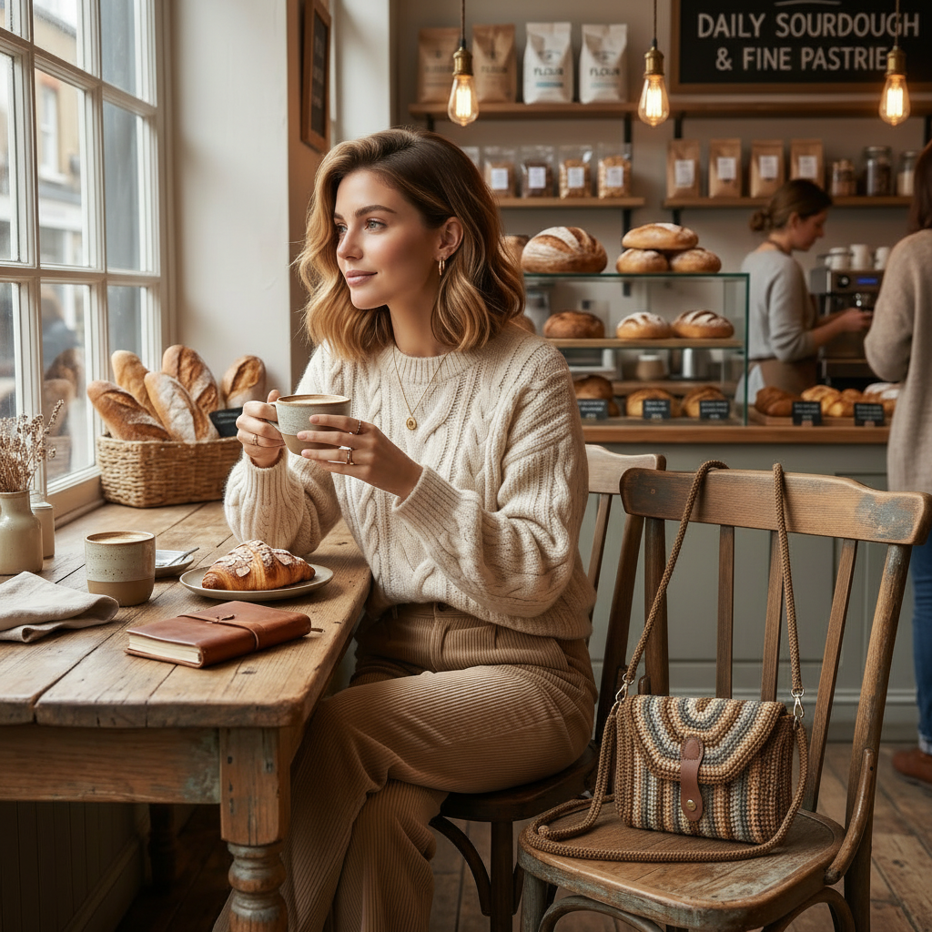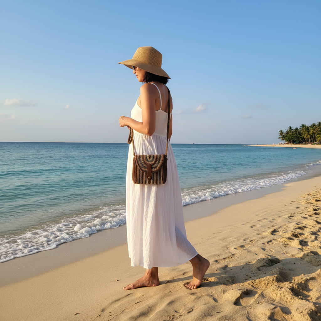 ხელით ნაქსოვი პატარა ჩანთა ყავისფერ ტონებში.